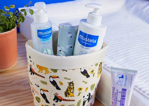 Productos esenciales para el baño del bebé Con un tamaño práctico y un bonito estapado de animales, el neceser de algodón permite guardar los cosméticos de higiene de un bebé tanto para un paseo como para ir de viaje. Incluye cuatro productos esenciales de Mustela para el baño: gel de baño suave, leche corporal hidratante, agua de colonia y crema bálsamo 1-2-3 para las rojeces e irritación del pañal.